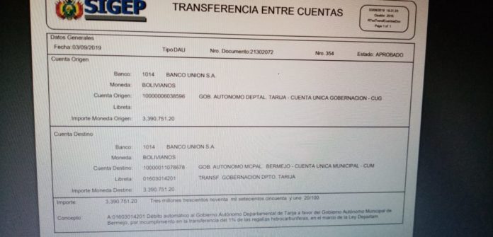 En la jornada del martes 3 de septiembre, el Gobierno Municipal de Bermejo logró otro débito automático de 3,3 millones de bolivianos que ejecutó el Ministerio de Economía para financiar sus proyectos concurrentes de 2018. La semana pasado igualmente instruyó dos débitos para el mismo fin.