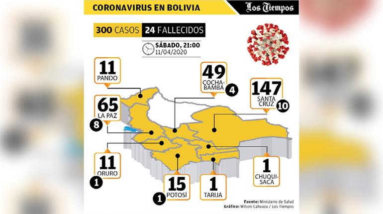 El Ministerio de Salud reportó ayer 25 nuevos casos de coronavirus Covid-19 en Bolivia, con lo que la cifra total de positivos llegó a 300; también se registraron cuatro decesos por el virus y la cantidad de muertos ascendió a 24.