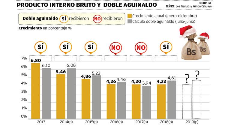 “Es claro que los ingresos por el gas y la soya (tomando en cuenta los precios internacionales) han bajado. Así, uno se atrevería a decir que dado el antecedente del año pasado más este año no deberá haber doble aguinaldo, pero la verdad es que esto es incierto sin información”, dijo Espinoza a tiempo de criticar la falta de datos del INE, cuyo último reporte sobre este tema data de diciembre del año pasado.