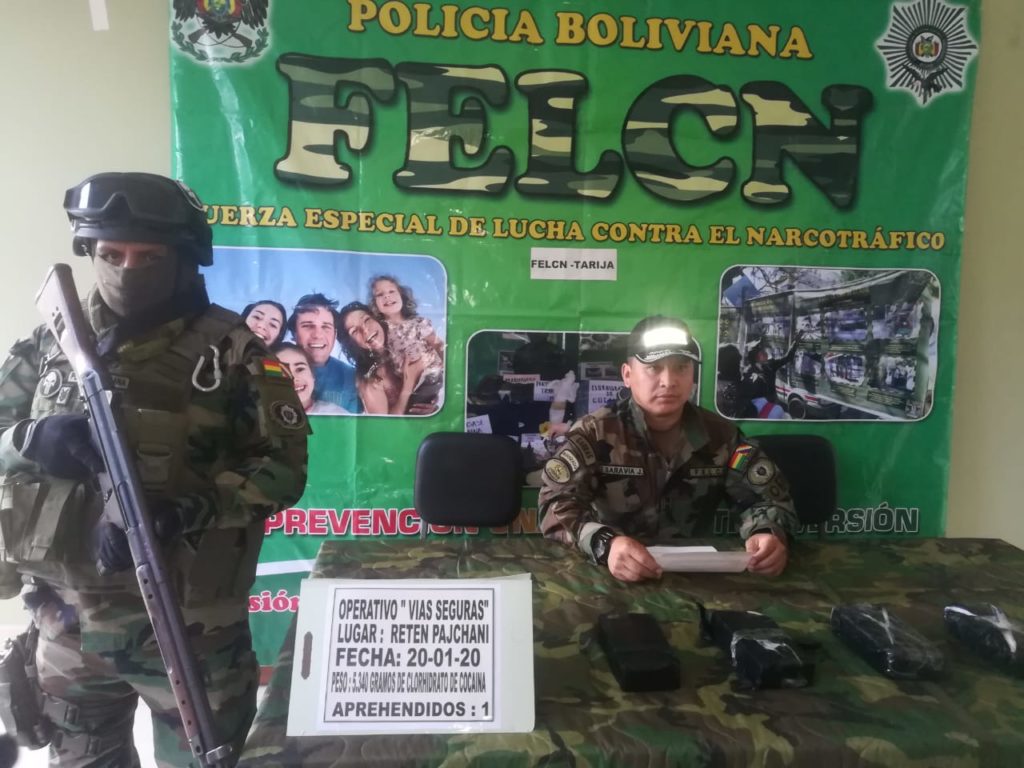 La Fuerza Especial de Lucha Contra el Narcotráfico (Felcn) de Tarija secuestró más de cinco kilogramos de colhidrato de cocaina, con un valor económico de alrededor de 9mil a 10mil dólares, el pasado 20 de enero a las 06h30, en el puesto de control de la comunidad de Pajchani. La información fue brindada por el mayor Jorge Sarabia C.