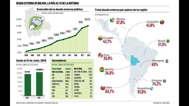 De acuerdo a los datos del Banco Central de Bolivia (BCB), a julio de 2018 la deuda llegaba a $us 9.746 millones, creciendo en 12 meses a $us 859 millones. Asimismo, los principales acreedores son el Banco Interamericano de Desarrollo (BID) con $us 3.170 millones y la República Popular de China con $us 952 millones.