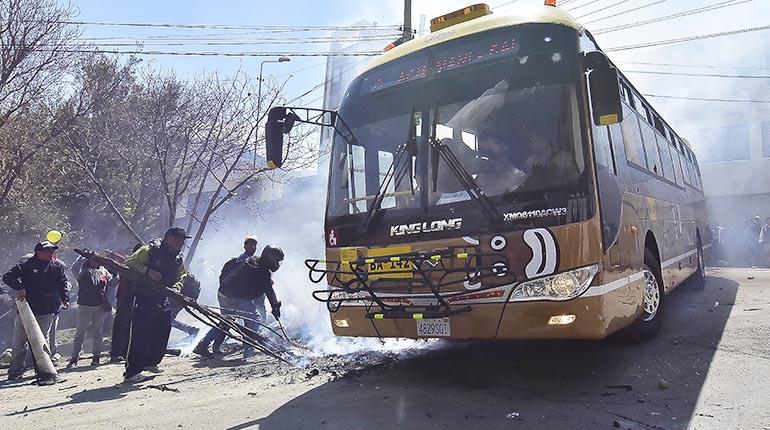 Pese a la oposición de los conductores, los buses partieron desde Achumani rumbo al centro de La Paz. Sin embargo, estos fueron objeto de la furia de los choferes.