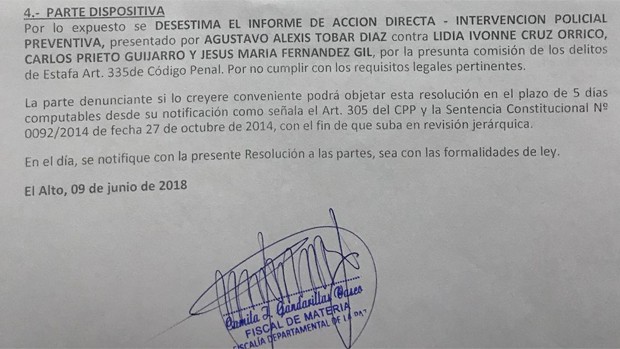 Asimismo, el grupo publicó el dictamen fiscal mediante el cual se desestima la denuncia de estafa que presentó Tobar.