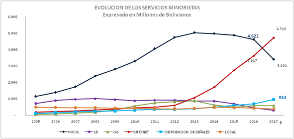 De acuerdo a la Autoridad, desde la gestión 2013 se produce un cambio de tendencias, dado el servicio de telefonía móvil empezó a decrecer levemente y el servicio de acceso a Internet creció a una tasa más elevada.