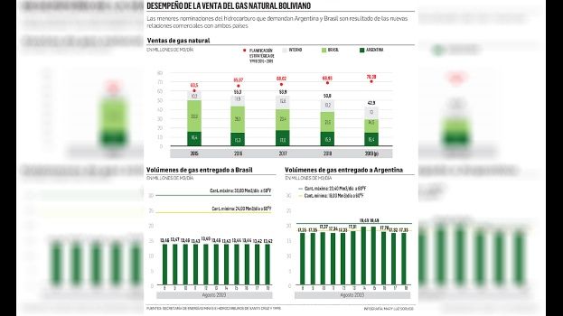 De acuerdo con el Centro Nacional de Medición y Control Hidrocarburífero de YPFB las exportaciones de gas a Brasil estuvieron lejos de la demanda mínima que es de 25 MMm3/d, porque la demanda del mercado brasileño no requirió, los primeros quince días de agosto de 2019, más de 14 MMm3/d.